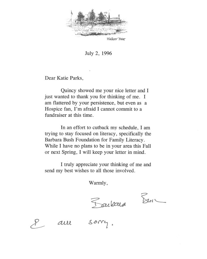 I wrote asking her to be the keynote speaker at Hospice’s annual fall event. The letter included pictures of Hogan, our Springer Spaniel puppy begging for her to say yes. I never expected such a personal reply.